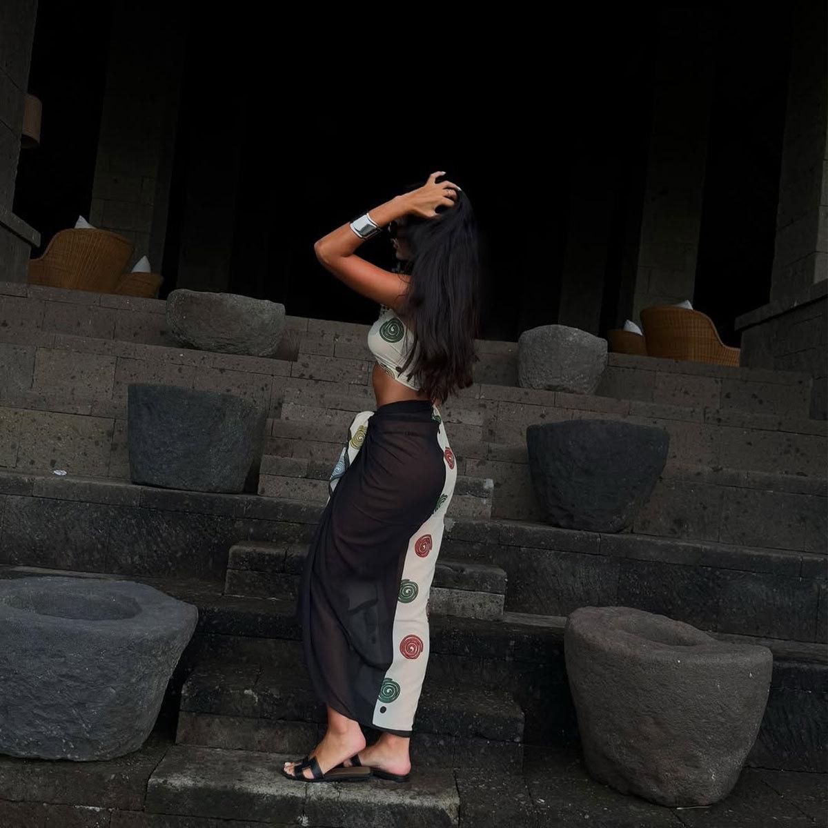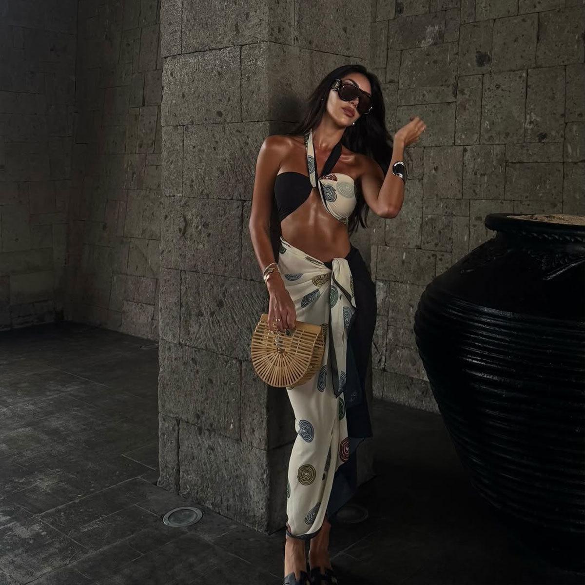 Channel effortless island elegance with the Costa Sirena Set, a stunning 3-piece ensemble featuring a sleek halter bikini top, matching bottoms, and a printed wrap skirt.