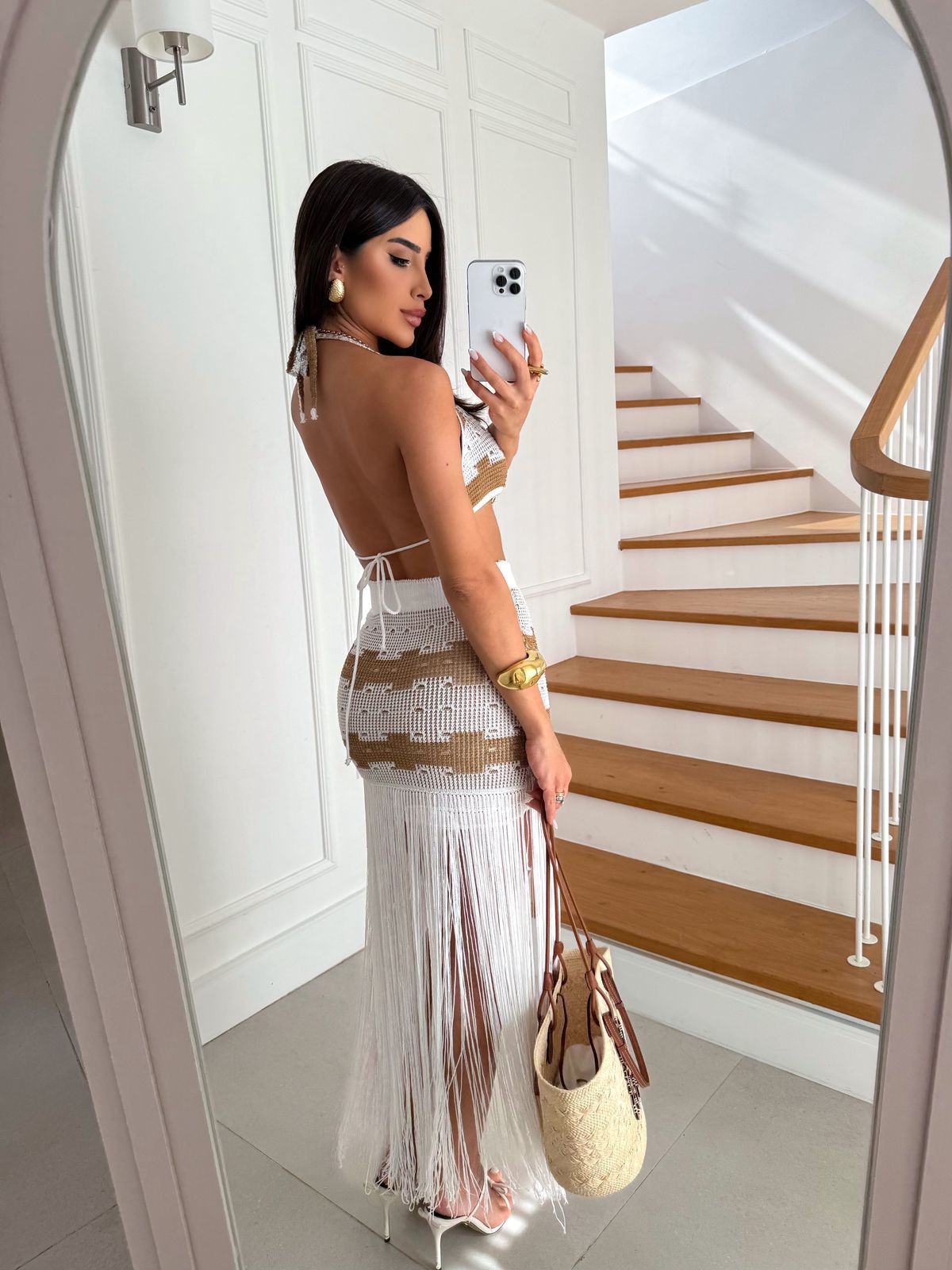 Bring a beachside glam to life in the Isla Set, featuring a crochet-style halter top and matching maxi shirt with playful fringe details.