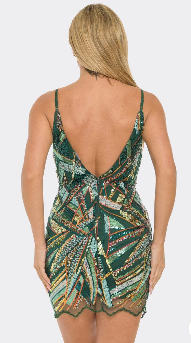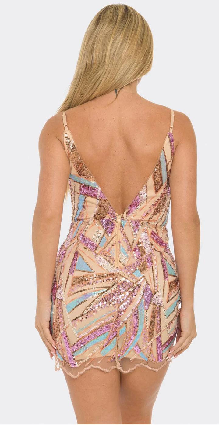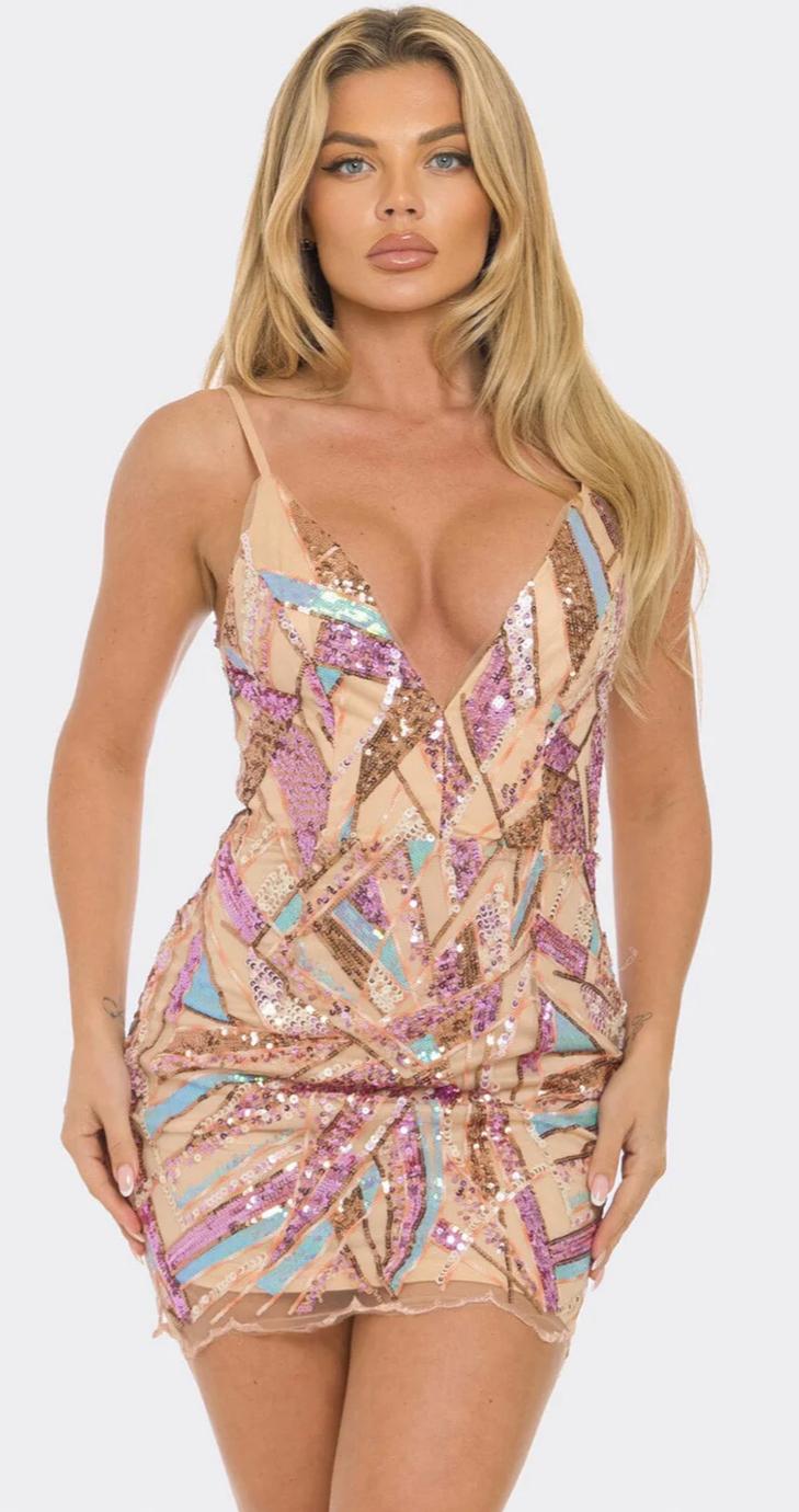A bold, body-hugging mini dress with a deep V-neck and spaghetti straps. It features a green mesh base and pink covered in multicolored sequins in a geometric pattern. Finished with a scalloped hem, it's perfect for parties or nights out.